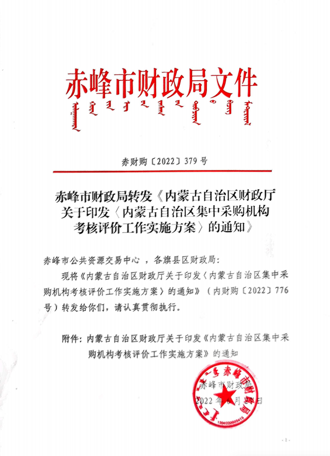 赤峰市财政局转发《内蒙古自治区财政厅关于引发<内蒙古自治区集中采购机构考核评价工作实施方案>的通知》